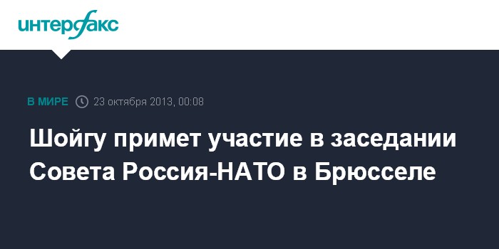 Москва. 23 октября. INTERFAX.RU - Министр обороны РФ генерал армии Сергей Шойгу примет участие в заседании Совета Россия-НАТО на уровне глав оборонных ведомств, которое состоится в среду в штаб-квартире Североатлантического альянса в Брюсселе.