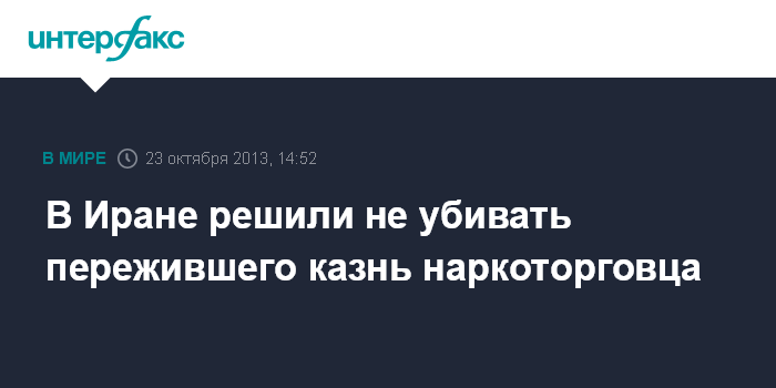 Дубай. 23 октября. INTERFAX.RU - В Иране отменили смертный приговор, вынесенный наркодилеру, пережившему собственное повешение, сообщает в среду министерство юстиции Ирана. "Заключенный, выживший после собственной казни, не будет повешен во второй раз. Если он выжил, нельзя его снова казнить", - заявил журналистам министр юстиции Мостафа Пур-Мохаммади.