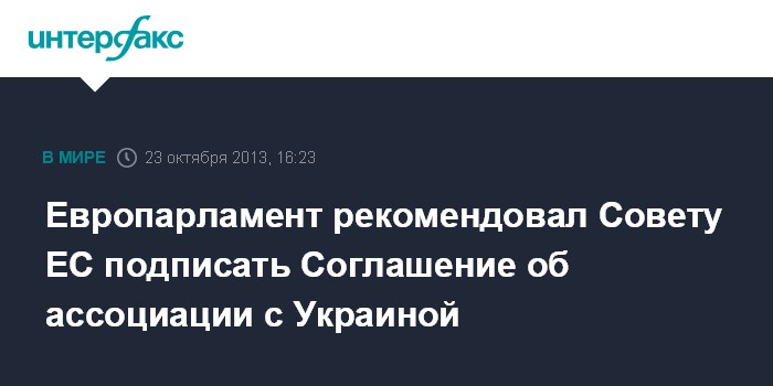 Брюссель. 22 октября. INTERFAX.RU - Европейский парламент рекомендует Совету ЕС подписать с Украиной Соглашение об ассоциации в случае выполнения Киевом необходимых условий и дает свое согласие на временное применение отдельных положений документа - почти 80% Соглашения.