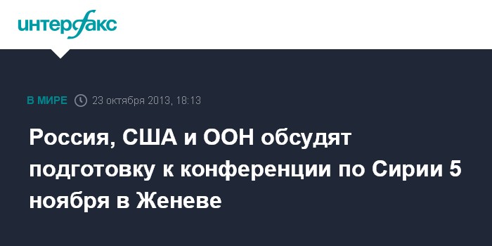 Москва.23 октября. INTERFAX.RU - Встреча по подготовке мирной конференции по Сирии "Женева-2" в формате Россия-США-ООН состоится 5 ноября в Женеве.