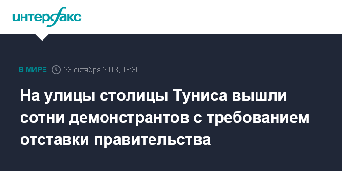 Дубай. 23 октября. INTERFAX.RU - Сотни демонстрантов, требующих отставки правительства, вышли на улицы столицы Туниса, передает в среду межарабский телеканал "Аль-Арабийя".
