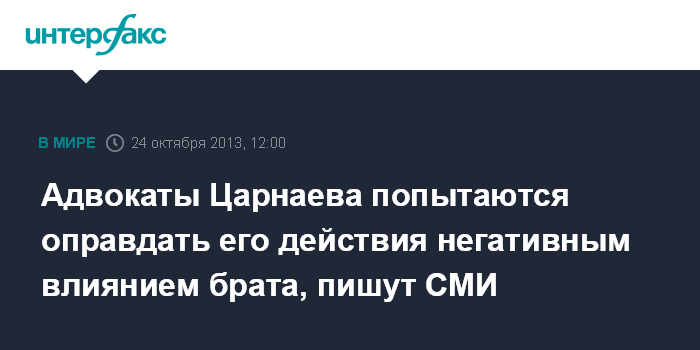 Лондон. 24 октября. INTERFAX.RU - Адвокаты Джохара Царнаева, обвиняемого в совершении теракта в Бостоне, могут попытаться доказать следствию, что преступные действия их подзащитного были во многом обусловлены негативным влиянием его старшего брата Тамерлана, сообщает в четверг британская газета The Guardian со ссылкой на правовых экспертов.
