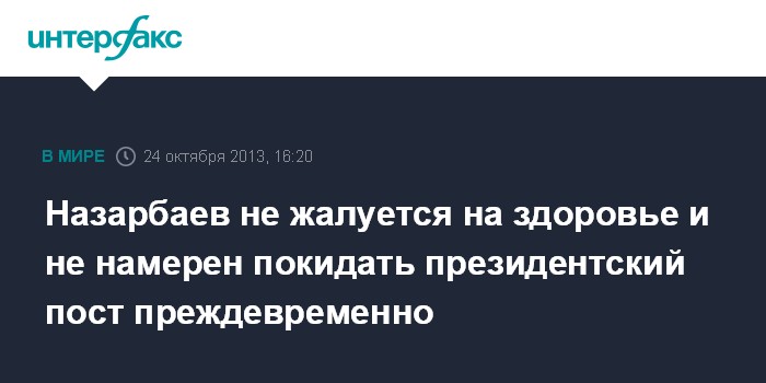 Астана. 24 октября. INTERFAX.RU - Президент Казахстана Нурсултан Назарбаев на встрече с жителями Уральска (адмцентр Западно-Казахстанской области) заявил, что чувствует себя нормально и не намерен уходить в отставку.