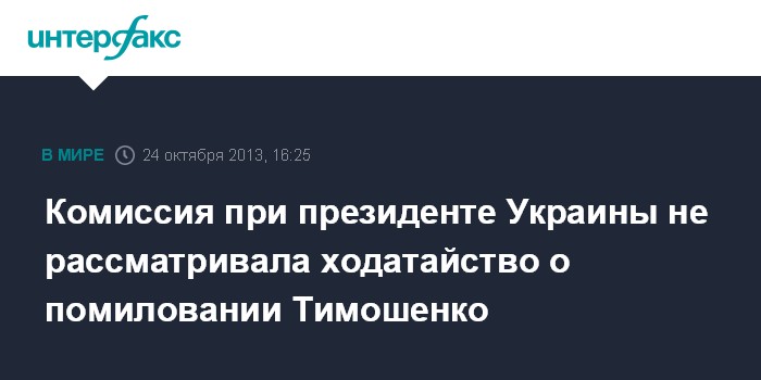 Киев. 24 октября. INTERFAX.RU - Комиссия по вопросам помилования при президенте Украины не рассматривала на заседании в четверг ходатайство миссии Европарламента (Кокса - Квасьневского) о помиловании экс-премьера Юлии Тимошенко.