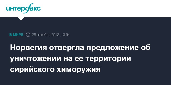 Дубай. 25 октября. INTERFAX.RU - Власти Норвегии не намерены заниматься уничтожением арсеналов сирийского химического оружия на своей территории, сообщает в пятницу межарабский телеканал "Аль-Арабийя".