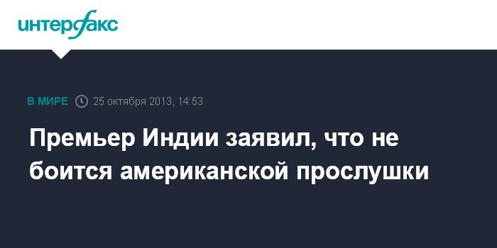 Дели. 25 октября. INTERFAX.RU - Индийский премьер-министр Манмохан Сингх, у которого нет мобильного телефона и персонального адреса электронной почты, не беспокоится по поводу сообщений в СМИ о том, что США прослушивают телефоны лидеров 35 стран, сообщили журналистам в пятницу в пресс-службе главы правительства.