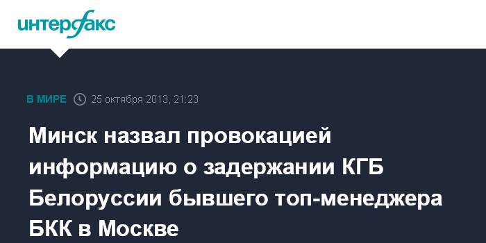 Минск. 25 октября. INTERFAX.RU - В Комитете госбезопасности Беларуси заявили, что распространенная информация о якобы имевшей место попытке задержания белорусскими спецслужбами в Москве одного из бывших топ-менеджеров Белорусской калийной компании (БКК) носит провокационный характер, и отказались ее комментировать.