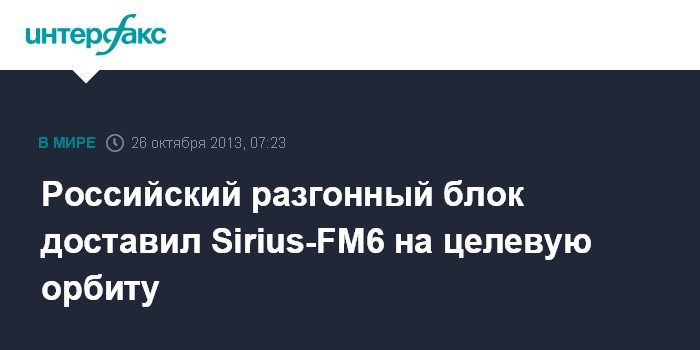 Байконур. 26 октября. INTERFAX.RU - Американский космический аппарат спутникового радиовещания Sirius-FM6 выведен на целевую орбиту высотой 35 тыс. 793 км (высшая точка орбиты), сообщили "Интерфаксу-АВН" в Роскосмосе. "Космический аппарат отделился от разгонного блока "Бриз-М". В ближайшее время он будет передан на управление компании-заказчика", - сообщил "Интерфаксу-АВН" представитель Роскосмоса.
