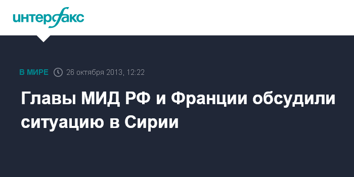 Москва. 26 октября. INTERFAX.RU - Глава МИД РФ Сергей Лавров обсудил по телефону с министром иностранных дел Франции Лораном Фабиусом ситуацию в Сирии, сообщает МИД РФ. "В ходе беседы обсуждался ряд актуальных международных проблем, представляющих взаимный интерес, включая ситуацию в Сирии, а также некоторые вопросы двустороннего сотрудничества", - говорится в сообщении департамента информации и печати МИД РФ.