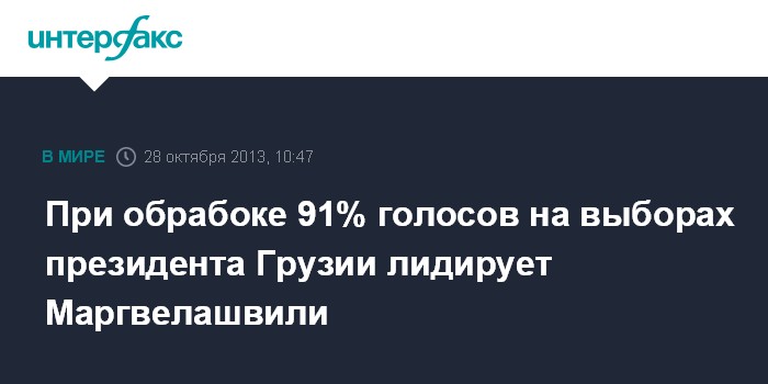 Тбилиси. 28 октября. INTERFAX.RU - ЦИК Грузии к утру понедельника обработал данные голосования на президентских выборах в воскресенье с 91% избирательных участков.