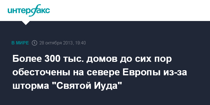 Лондон. 28 октября. INTERFAX.RU - Более 300 тыс. домов в ряде районов в северной части Европы - Британии, Франции и Нидерландах остались без электричества из-за мощного шторма "Святой Иуда", обрушившегося на Британию, Францию и Нидерланды, сообщают в понедельник европейские СМИ.