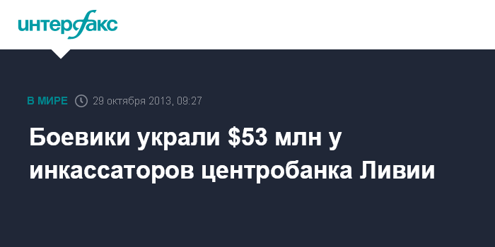 Лондон. 29 октября. INTERFAX.RU - Около десяти вооруженных лиц в ливийском городе Сирт совершили нападение на инкассаторский автомобиль, перевозивший $53 млн для центрального банка страны, сообщает британская телерадиокорпорация BBC.