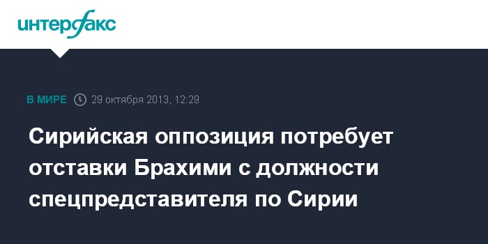 Дубай. 28 октября. INTERFAX.RU - Оппозиционный Сирийский национальный совет (СНС) намерен потребовать от Лиги арабских государств (ЛАГ) освободить Лахдара Брахими от исполнения обязанностей спецпредставителя по Сирии, передает во вторник межарабский телеканал "Аль-Арабийя".