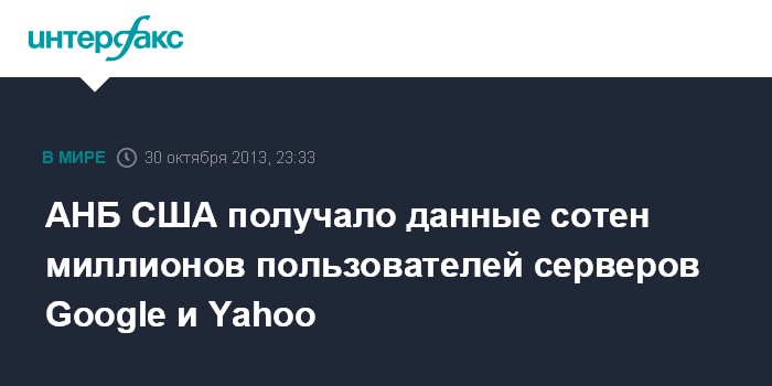 Вашингтон. 30 октября. INTERFAX.RU - Агентство национальной безопасности (АНБ) США получало информацию с поисковых серверов Google и Yahoo и собрало данные учетных записей сотен миллионов пользователей, сообщает в среду веб-сайт газеты The Washington Post со ссылкой на документы, предоставленные экс-сотрудником ЦРУ Эдвардом Сноуденом.