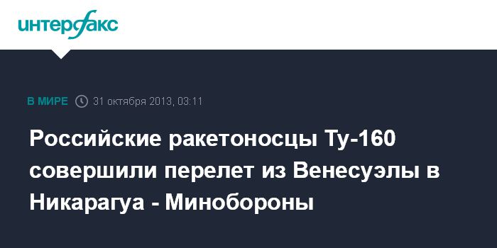 Москва. 31 октября. ИНТЕРФАКС - Два сверхзвуковых стратегических бомбардировщика-ракетоносца Ту-160 совершили перелет с аэродрома "Майкетия" Венесуэлы на аэродром "Манагуа" Никарагуа, сообщает управление пресс-службы и информации Минобороны России.