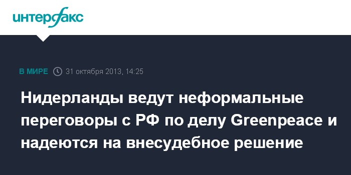 Гаага. 31 октября. INTERFAX.RU - Голландская сторона рассчитывает, что судьбу задержанных в России активистов Greenpeace можно будет решить внесудебным порядком.