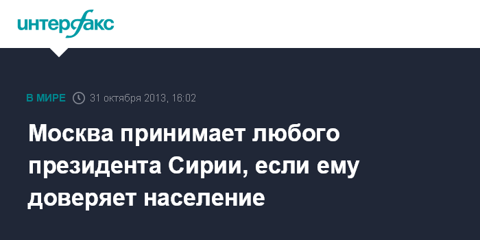 Москва. 31 октября. INTERFAX.RU - Россия принимает любую фигуру на посту президента Сирии, если она пользуется доверием граждан этой страны.