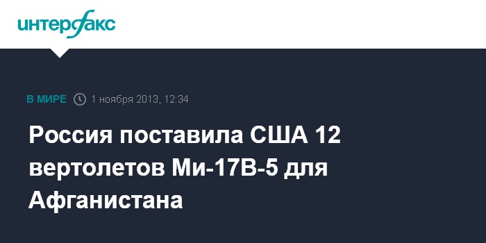 Москва. 1 ноября. INTERFAX.RU - Поставка 12 военно-транспортных вертолетов Ми-17В-5 по дополнительным соглашениям, заключенным с правительством США в 2012 г. в рамках опциона основного контракта, завершена в октябре, информирует ОАО "Рособоронэкспорт".
