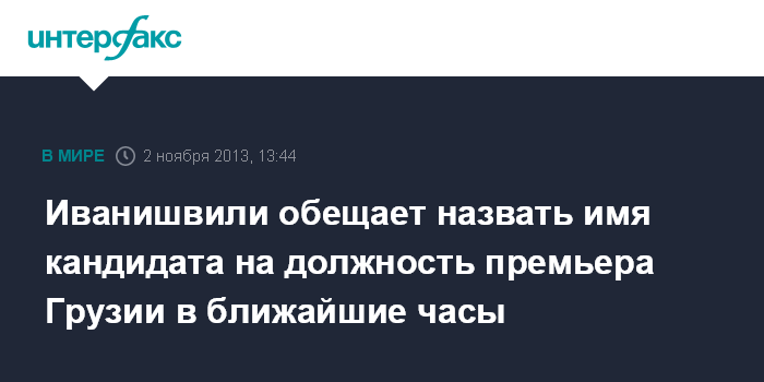 Тбилиси. 2 ноября. INTERFAX.RU - Имя кандидата на пост премьер-министра Грузии действующий глава кабинета Бидзина Иванишвили назовет в субботу в 15.30 по местному времени (совпадает с московским), сообщает в субботу пресс-служба правительства Грузии. В сообщении сказано, что соответствующее заявление Б.Иванишвили сделает в центральном офисе правящей коалиции "Грузинская мечта" в Тбилиси.