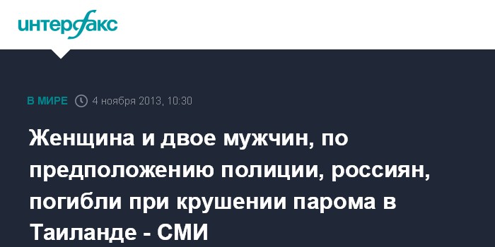 Ранее со ссылкой на тайские СМИ сообщалось, что в результате крушения парома в Таиланде погибли шесть человек, в том числе двое россиян. Всего на борту парома находилось более 200 человек.
