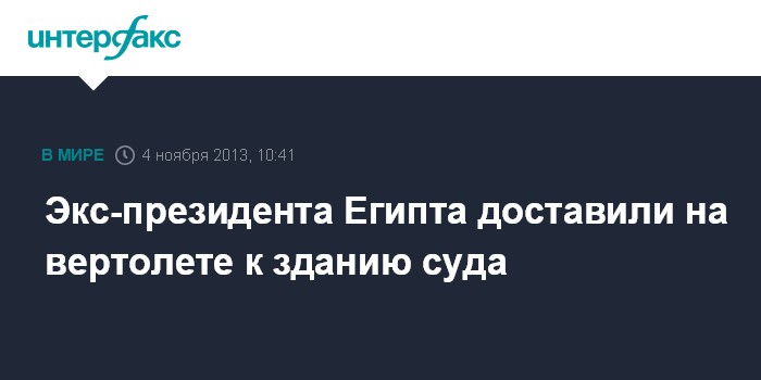 Каир. 4 ноября. INTERFAX.RU - Бывший президент Египта Мухаммед Мурси прибыл на территорию комплекса тюрьмы "Тора" на юге Каира, где позднее в понедельник пройдут судебные слушания по его делу, передает агентство AP. Бывшего главу государства доставили на территорию тюрьмы на вертолете, отмечает агентство.