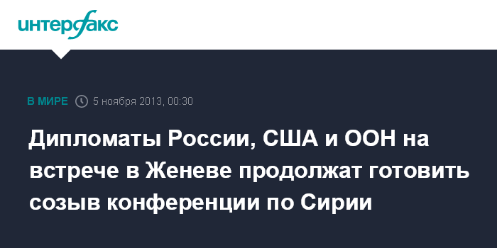 Москва. 5 ноября. ИНТЕРФАКС - Очередная трехсторонняя встреча Россия-США-ООН по подготовке международной конференции по Сирии "Женева-2" состоится во вторник.