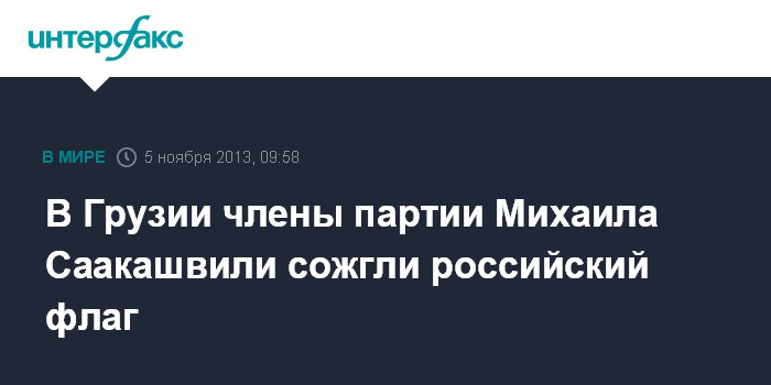 Тбилиси. 5 ноября. INTERFAX.RU - Группа радикально настроенных членов бывшей правящей партии "Единое национальное движение" в ночь на вторник на главном проспекте Агмашенебели в городе Поти сожгли российский флаг, вывешенный вместе с флагами других государств в связи с проводимым в городе детским фестивалем.