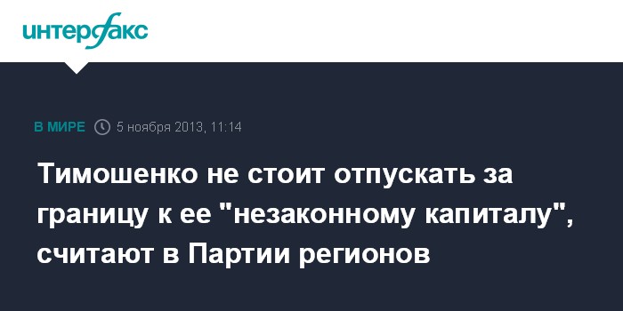 Киев. 5 ноября. INTERFAX.RU - Выпускать экс-премьера Украины Юлию Тимошенко из страны за границу в настоящее время нецелесообразно в связи с открывшимися новыми обстоятельствами, свидетельствующими о наличии у нее значительного капитала сомнительного происхождения за рубежом, подчеркивает народный депутат (фракция Партии регионов) Владимир Олейник.
