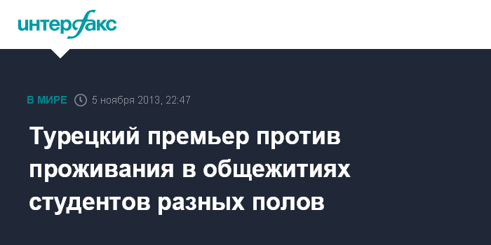 Стамбул. 5 ноября. INTERFAX.RU - Премьер-министр Турции Реджеп Тайип Эрдоган подтвердил намерение своего правительства принять меры против общежитий для студентов обоих полов, сообщает во вторник турецкая газета "Хюрриет".