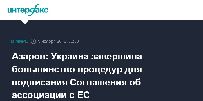 Киев. 5 ноября. INTERFAX.RU - Украина завершила большинство процедур для подписания Соглашения об ассоциации с Евросоюзом, и есть все основания рассчитывать на позитивный результат Вильнюсского саммита, заявляет премьер-министр Украины Николай Азаров.