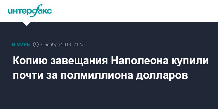 Париж. 6 ноября. INTERFAX.RU - Единственная сохранившаяся копия завещания Наполеона Бонапарта была продана на аукционе в столице Франции за $483 тыс., сообщают в среду агентство Assciated Press.
