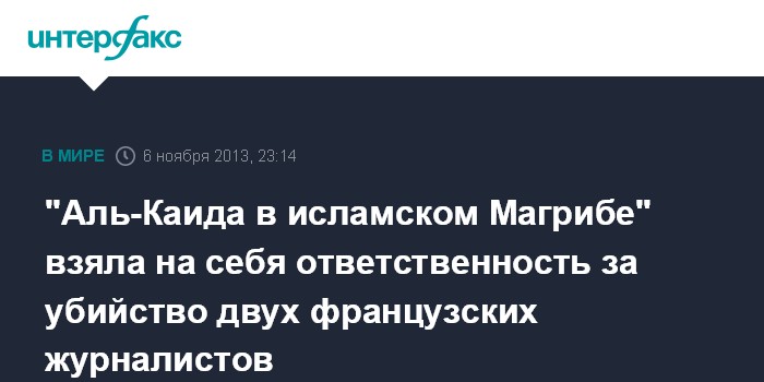 Париж. 6 ноября. INTERFAX.RU - Боевики из организации "Аль-Каида в исламском Магрибе" заявили о своей причастности к убийству двух французских корреспондентов радио РФИ на севере Мали, сообщает в среду телеканал France 24.