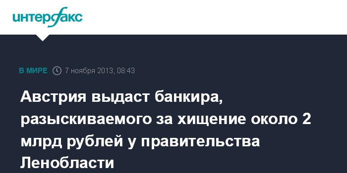 Австрия выдаст банкира, разыскиваемого за хищение около 2 млрд рублей у правительства Ленобласти