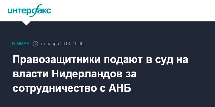 Брюссель. 7 ноября. INTERFAX.RU - Группа правозащитников, журналистов и юристов обратилась в суд с иском в отношении властей Нидерландов в связи с их предполагаемым сотрудничеством с зарубежными спецслужбами, сообщает в среду агентство AP.