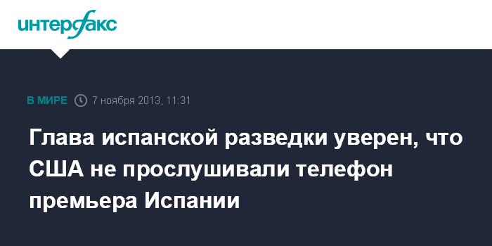 Мадрид. 7 ноября. INTERFAX.RU - Американские спецслужбы, скорее всего, не вели прослушку телефонных разговоров премьер-министр Испании Мариано Рахоя, заявил глава испанского Национального центра разведки Феликс Санс Рольдан.