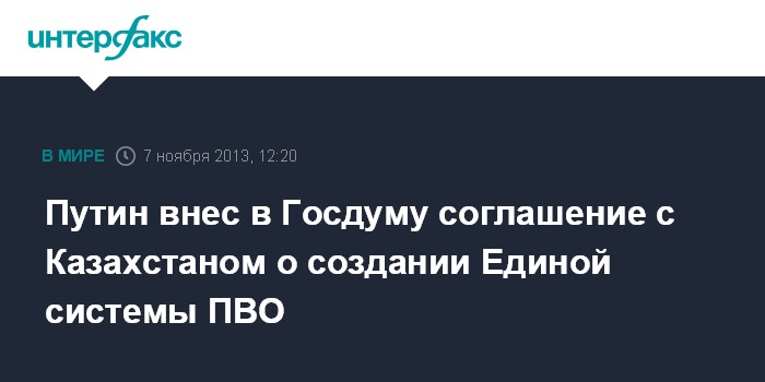 Москва. 7 ноября. INTERFAX.RU - Президент России Владимир Путин внес на ратификацию в Госдуму соглашение с Казахстаном о создании Единой региональной системы противовоздушной обороны двух стран.