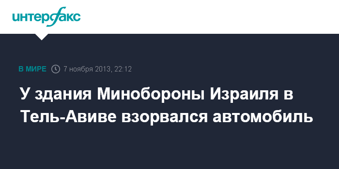 Иерусалим. 7 ноября. INTERFAX.RU - Начиненный взрывчаткой автомобиль взлетел на воздух у здания израильского министерства обороны в Тель-Авиве, сообщает в четверг газета The Times of Israel.