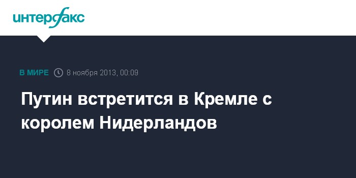 Москва. 8 ноября. INTERFAX.RU - Президент РФ Владимир Путин встретится в пятницу в Кремле с королем Нидерландов Виллемом-Александром.