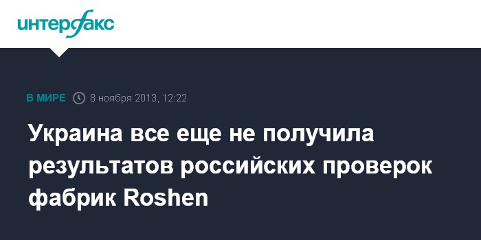Киев. 8 ноября. INTERFAX.RU - Министерство аграрной политики и продовольствия Украины до сих пор не получило официальной документации по результатам проверки кондитерских фабрик корпорации Roshen специалистами Роспотребнадзора.