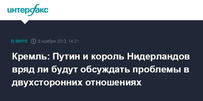 Москва. 8 ноября. INTERFAX.RU - В Кремле полагают, что сложности, возникшие в последнее время в российско-голландских отношениях, не будут затрагиваться на встрече в пятницу президента России Владимира Путина с королем Нидерландов Виллемом-Александром, но могут стать предметом бесед министров, сопровождающих монарха, с их российскими коллегами.