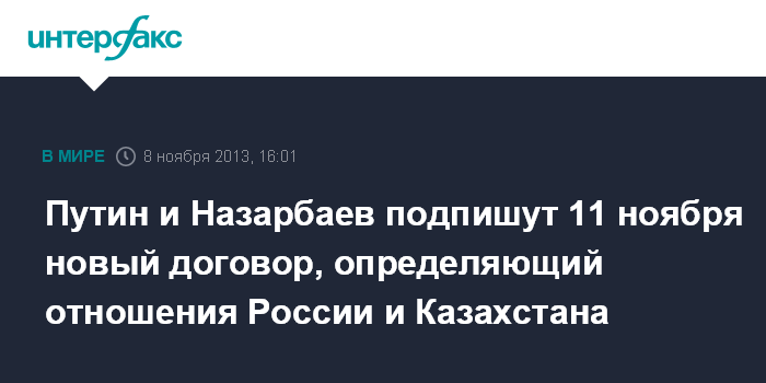 Москва. 8 ноября. INTERFAX.RU - Новый базовый договор, определяющий союзнические отношения России и Казахстана в XXI веке, подпишут 11 ноября в Екатеринбурге президенты двух стран Владимир Путин и Нурсултан Назарбаев.