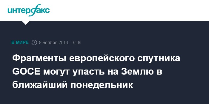 "Спутник GOCE (по каталогу Командования воздушно-космической обороны Северной Америки НОРАД - № 34602, международный номер - 2009-013А) может войти в плотные слои атмосферы примерно в 10:58 - 11:58 МСК 11 ноября", - сообщается на сайте НОРАД.