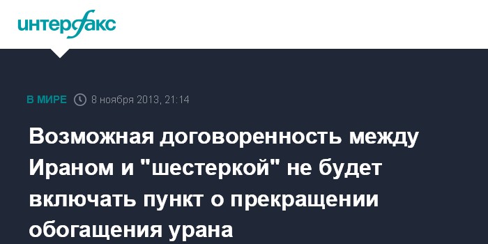 Каир. 8 ноября. INTERFAX.RU - Замглавы МИД Ирана Аббас Аракчи заявил в пятницу в Женеве, что обсуждаемое соглашение между Тегераном и "шестеркой" международных посредников не предусматривает остановку деятельности по обогащению урана, передает иранское агентство "Фарс".