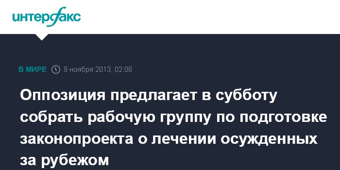 Киев. 9 ноября. ИНТЕРФАКС-УКРАИНА - Депутаты от оппозиционных фракций парламента предлагают в субботу собрать заседание рабочей группы по подготовке законопроекта о лечении осужденных за рубежом.