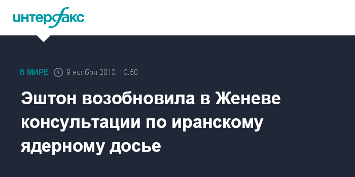 Женева. 9 ноября. INTERFAX.RU - Верховный представитель ЕС по иностранным делам и политике безопасности Кэтрин Эштон в субботу возобновила контакты в Женеве с участниками переговоров по иранской ядерной проблеме, сообщил ее представитель Майкл Манн. "Глава европейской дипломатии Эштон продолжает интенсивные контакты и консультации этим утром по иранской тематике", - написал он в сети "Твиттер".