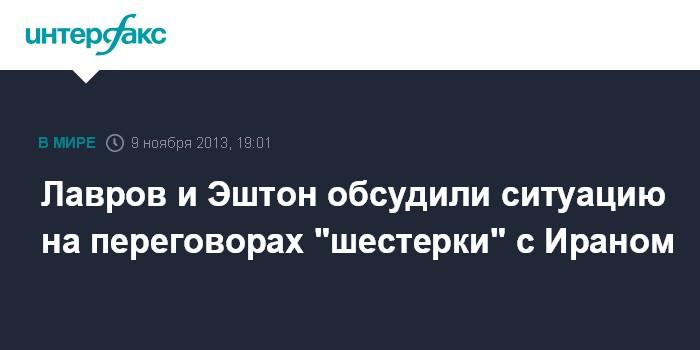 Москва. 9 ноября. INTERFAX.RU - Глава МИД РФ Сергей Лавров и Высокий представитель ЕС по иностранным делам и политике безопасности Кэтрин Эштон на встрече в субботу в Женеве обсудили ситуацию на переговорах "шестерки" с Ираном. "Проведено детальное рассмотрение ситуации на раунде переговоров в формате "шестерка" - Иран, включая согласование мер укрепления доверия и снятия озабоченностей в связи с иранской ядерной программой", - говорится в сообщении МИД РФ.