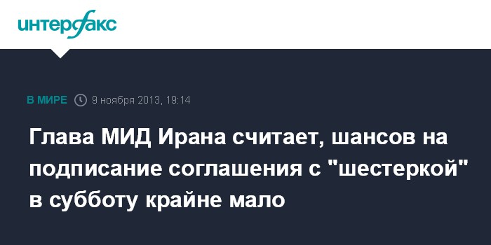 Женева. 9 ноября. INTERFAX.RU - Глава МИД Ирана Джавад Зариф сомневается, что в субботу будет подписано соглашение с "шестеркой" по иранской ядерной программе. "Шансов, что в субботу будет подписано соглашение с "шестеркой", крайне мало", - сказал он иранским журналистам.
