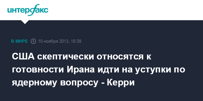 Вашингтон. 10 ноября. INTERFAX.RU - Соединенные Штаты сохраняют скептицизм в вопросе готовности Ирана пойти на серьезные уступки по своей ядерной программе, заявил госсекретарь США Джон Керри. "Мы не слепцы, не думаю, что мы глупцы. Я считаю, что мы занимаем достаточно твердую позицию в вопросе оценок того, действуем ли мы в интересах своей страны и мира ", - заявил дипломат в интервью телеканалу NBC.
