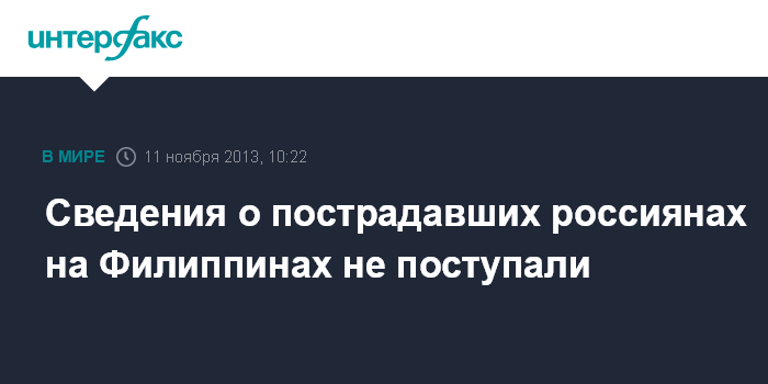 Москва/Манила. 11 ноября. INTERFAX.RU - В российское посольство на Филиппинах пока не поступало информации о россиянах, пострадавших от разрушительного тайфуна "Хайян".