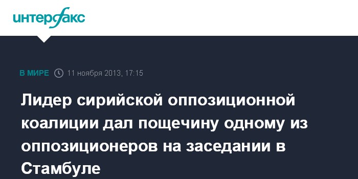 Дубай. 11 ноября. INTERFAX.RU - Председатель Национальной коалиции сирийских революционных и оппозиционных сил (НКСРОС) Ахмад Джарба дал пощечину представителю Сирийской свободной армии Луи Микдаду на заседании оппозиционеров в Стамбуле, передает в понедельник ливанский телеканал Al Mayadeen.